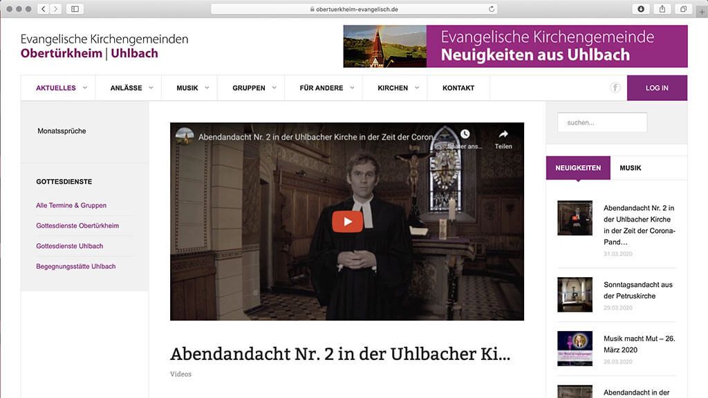 Zusätzlich zu der auf ehrenamtlicher Basis von logowerbung geschaffenen neuen Videorubrik, kommt die Gemeinde nun dem »digitaler Gemeindebrief« einen weiteren Schritt näher. Ergänzend zum Gemeindebrief informiert die Internet-Seite so auch kurzfristig über die vorgesehenen Termine innerhalb der beiden Kirchengemeinden. Die Kirchengemeinde-Website ist zu finden unter www.kirche-obertuerkheim-uhlbach.de