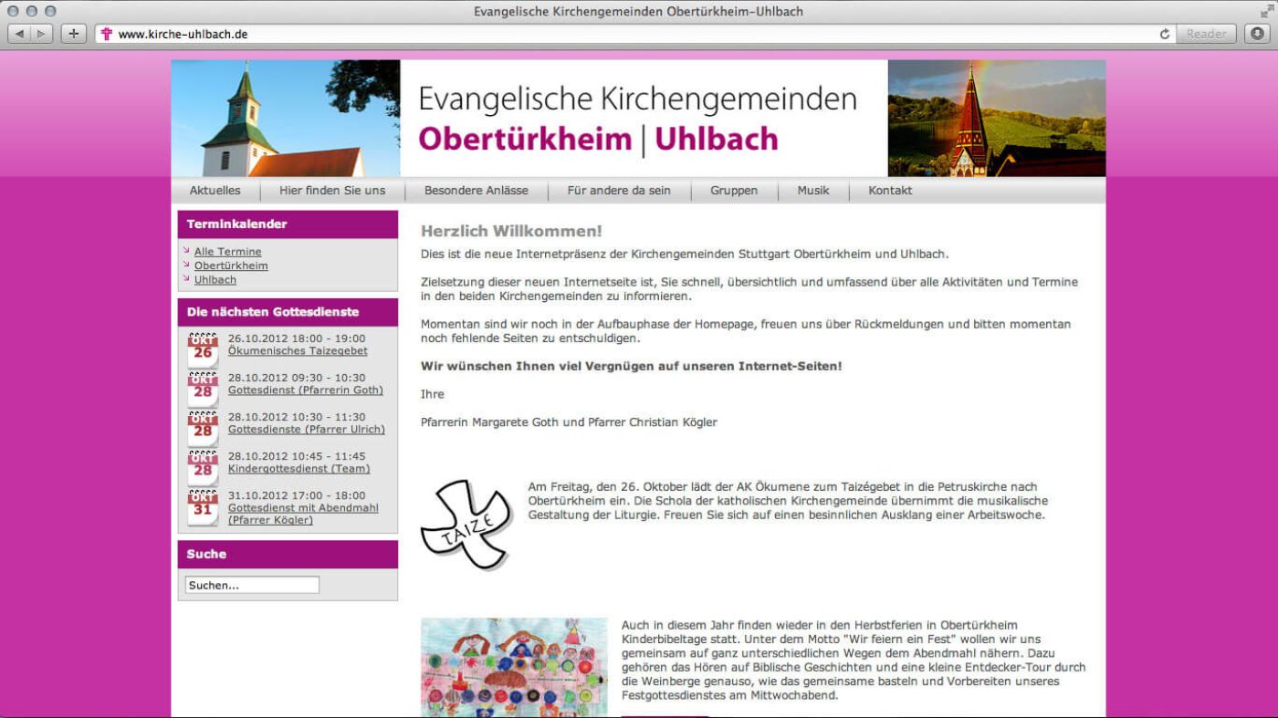 Zur reibungsloseren Umsetzung und Produktion des zweimonatlich erscheinenden Gemeindebriefs »Heilix Blättle« wurde diese Internetpräsenz als klassisches Redaktionssystem aufgesetzt. Nun schließt sich der Kreis und mit der nächsten gedruckten Ausgabe des Gemeindebriefs werden die im Internet erfassten Inhalte redaktionell aufbereitet als »digitaler Gemeindebrief« publiziert. Außerdem informiert die Seite über die anstehenden Termine innerhalb der beiden Kirchengemeinden, aktuelle und vergangene Veranstaltungen und vieles mehr ... zu finden ist die neue Seite unter www.kirche-obertuerkheim-uhlbach.de