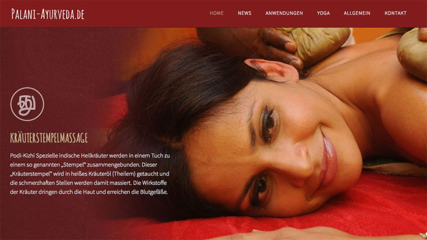 Man kann den Duft der von Palani Mildenberger verwendeten Kräuteröle förmlich riechen. Das war zumindest das Ziel, das Thema Entspannung, Massage und Wohlbefinden in html/css und Co. umzusetzen. Zahlreiche stimmungsvolle Bilder der vielfältigen ayurvedischen Therapieformen sowie ein Fullscreen-Film über eine Kräuterstempel-Massage lassen so ein stimmungsvolles Ganzes entstehen. Eine doch recht aufwändig umgesetzte Webpräsenz mit umfangreichen Bildmontagen und warmen Farbstimmungen.