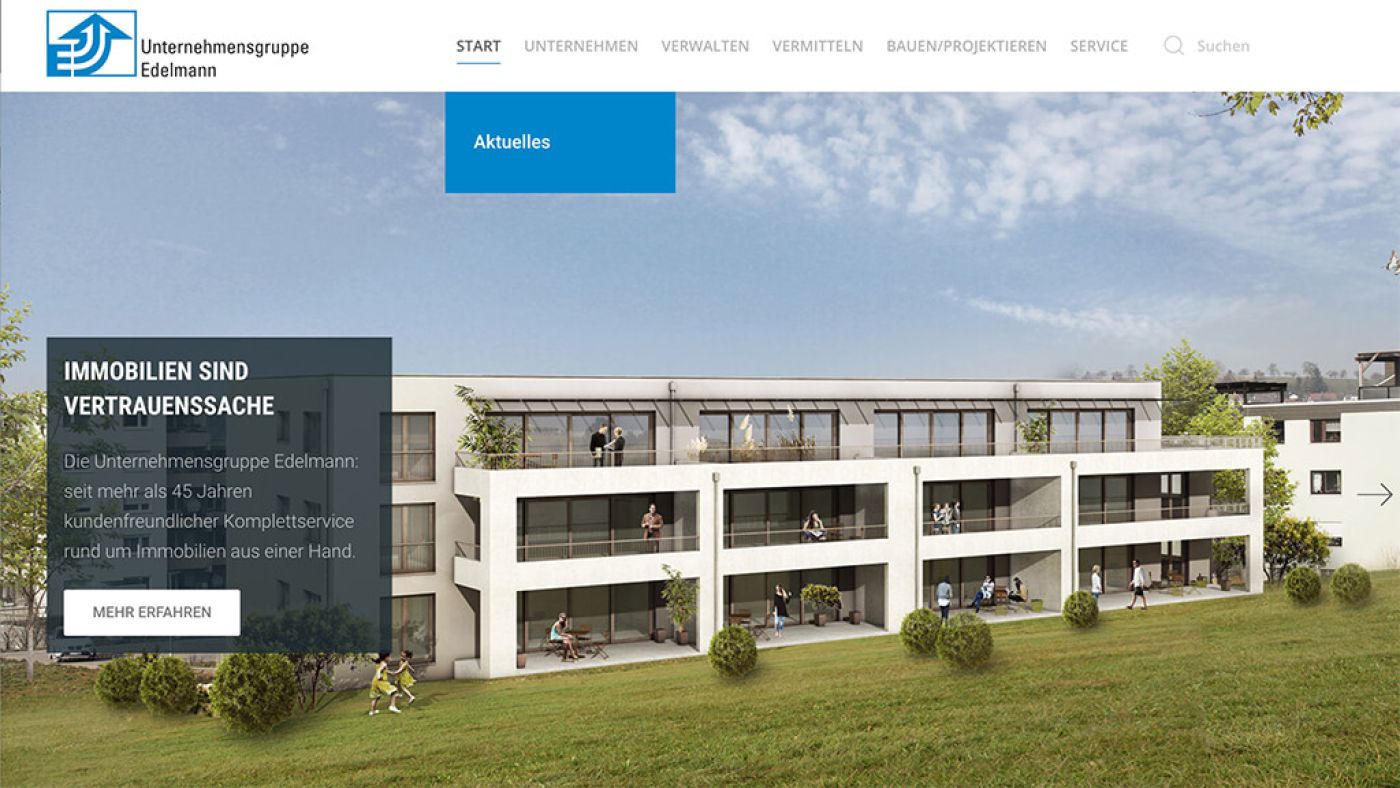 Seit 1971 ist die Unternehmensgruppe Edelmann in Göppingen eine feste Größe in der Immobilienbranche. Neben der WEG- und Mietverwaltung ist das Unternehmen auch als Bauträger und Immobilien-Vermittler äußerst erfolgreich und gehört mittlerweile zu den renommiertesten Adressen in der Region. Dementsprechend sollte das Redesign der Webpräsenz hochwertig, vertrauensvoll und sachlich klar alle vier Unternehmensbereiche "unter einen Hut" bringen.