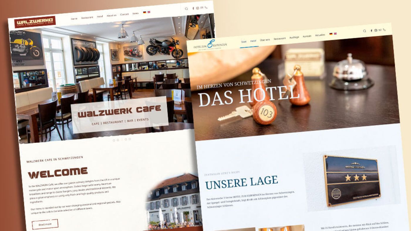 In bester Lage in Schwetzingen, direkt vor dem Schwetzinger Schloss, befindet sich das "Hotel zum Erbprinzen" sowie das angeschlossene "Walzwerk Cafe" unter einem Dach. Bereits seit 2013 ist das von Marcus Walz und Ali Ghawami umgesetzte Gastro-Konzept ein fester Bestandteil in der gastronomischen Landschaft in Schwetzingen. Höchste Zeit also, die in die Jahre gekommenen Webseiten einem Relaunch zu unterziehen.