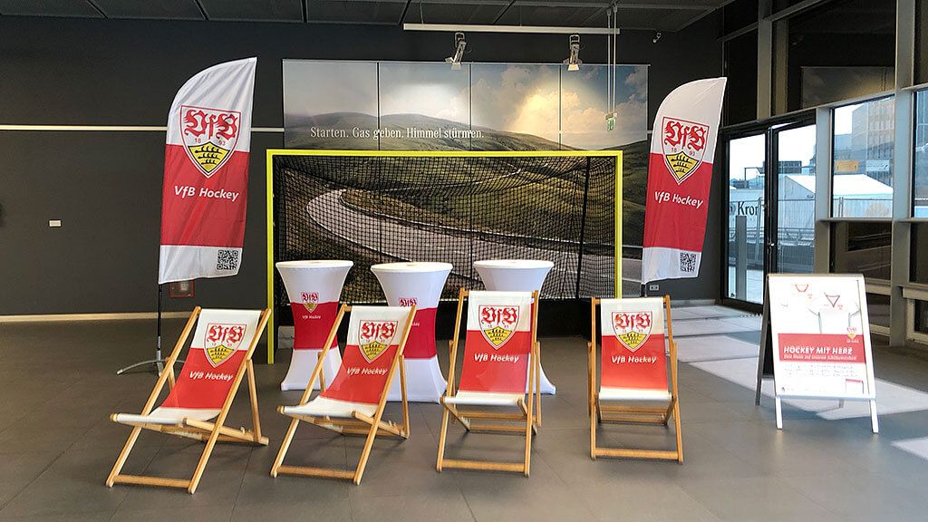 Am vergangenen Sonntag feierten über 35.000 Besucher beim "Tag des Brustrings" rund um das Mercedes Museum das Jubiläumsfest für unseren VfB. Mit dabei und gut klimatisiert in den Räumen der Mercedes-Niederlassung die VfB Hockeyabteilung mit den frisch produzierten Squareflags, Tischhussen, Liegestühlen, Plakaten und Flyern. Allesamt von logowerbung entworfen und produziert. Dazu kamen kurzfristig auch noch neue Bandenwerbungen für die VfB Leichtathletik-Abteilung.