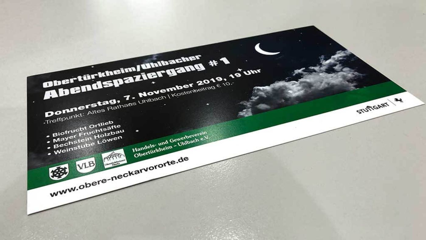Bei der Veranstaltung werden jeweils vier teilnehmende Betriebe bei einem Abendspaziergang vorgestellt – mit ortsgeschichtlichem Begleiter durch den Bürgerverein Obertürkheim-Uhlbach e.V. logowerbung unterstützte den HGV von den ersten Ideentreffen bis zur Umsetzung und Finalisierung der Werbemittel bei diesem spannenden Projekt. Es wurden Plakate, Postkarten, Eintrittskarten, Buttons und eine Dropflag für das Projekt gestaltet und produziert. Wir sind gespannt auf die Resonanz. Im Frühjahr und Sommer 2020 sind die nächsten Abendspaziergänge vorgesehen.