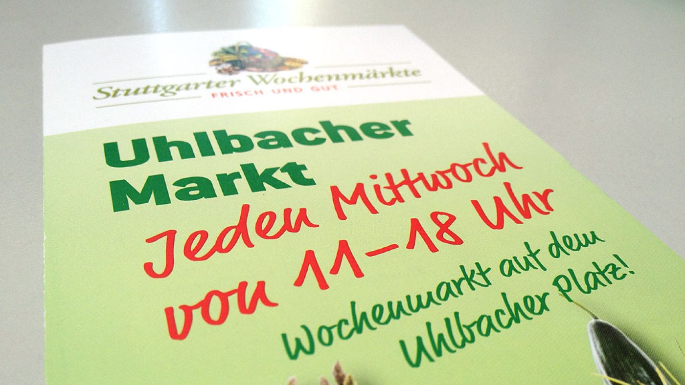 Am 7. Mai 2014 ist es soweit: Der Stuttgarter Oberbürgermeister Fritz Kuhn wird den ersten Uhlbacher Wochenmarkt offiziell eröffnen. Zukünftig wird dieser wöchentlich mittwochs stattfinden. Frei nach dem Motto "Alles drin" hat logowerbung kurzfristig den Werbeauftritt in Form von Prospekten, Plakaten und Anzeigen umgesetzt und produziert.