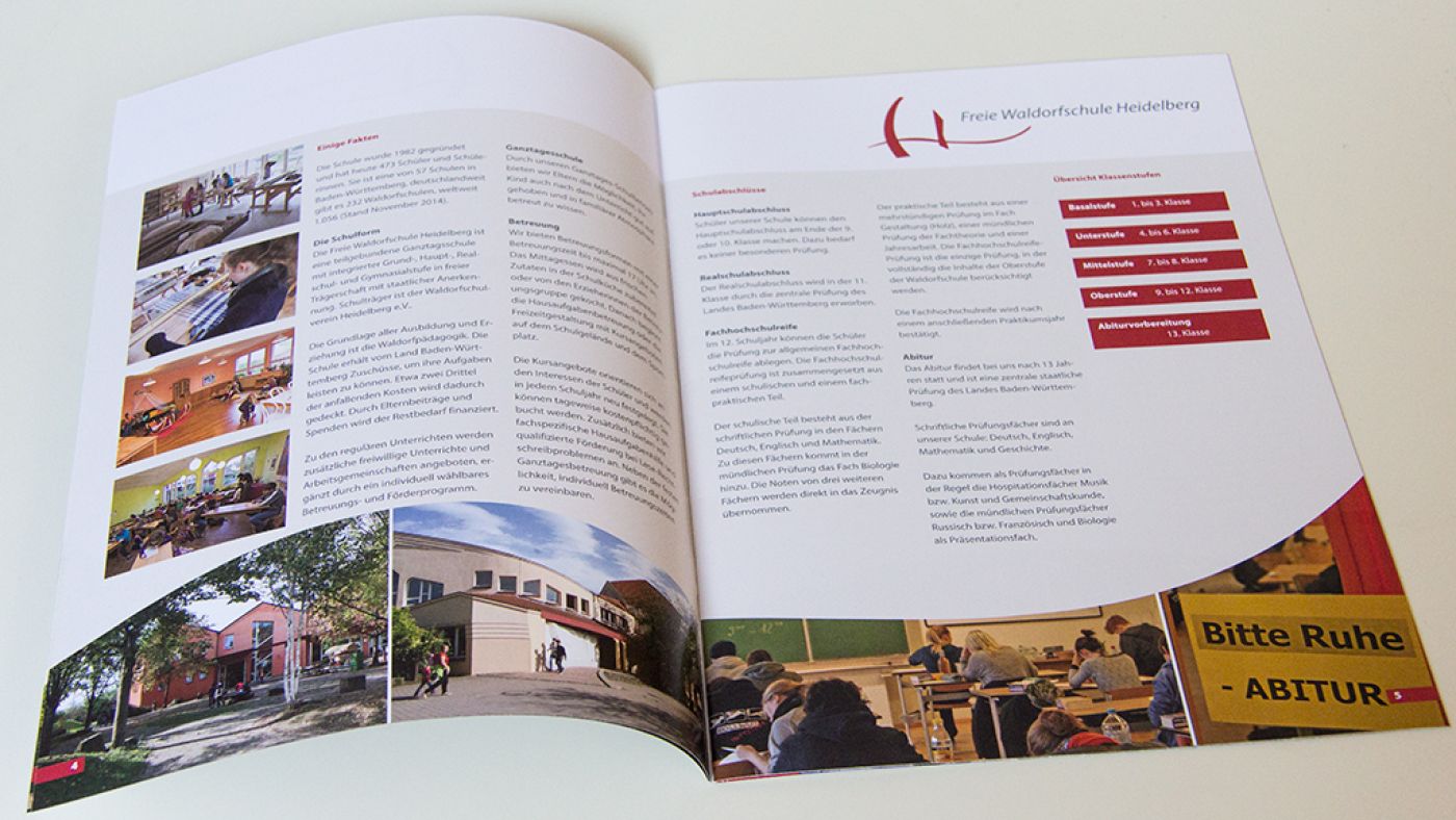 In Zusammenarbeit mit dem Kollegium sowie engagierten Eltern wurde die neue Imagebroschüre der Freien Waldorfschule Heidelberg e.V. fertig gestellt. Dabei herausgekommen ist eine Broschüre, die bislang von allen Seiten eine äussert positiv Resonanz erfährt und in der sich die ganze Schule wiederfindet. Im Mittelpunkt dieser Broschüre stehen die Besonderheiten dieser Waldorfschule und soll vor allem zukünftigen Eltern eine Entscheidungshilfe sein. Wir meinen, das ist in symphatischer Art und Weise gelungen.