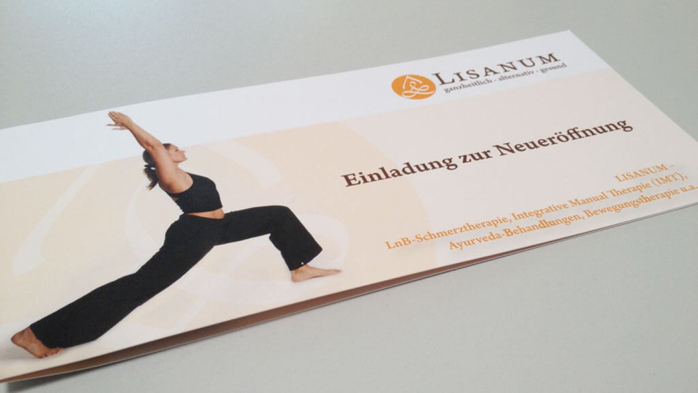 Die Verbindung altbewährter ayurvedischer Behandlungsmethoden mit neuem, westlichen Wissen: das ist Lisanum in Ilvesheim bei Mannheim. Zur ganzheitlichen Praxis gehört auch ein ganzheitlicher Werbeauftritt. Sämtliche Geschäftspapiere, Praxisschilder, Einladungen und Flyer wurden von uns kurzfristigst umgesetzt. Nach der offiziellen Eröffnung am 21. April 2012 werden noch die restlichen Projekte wie Fahrzeug- und Praxisbeschriftungen sowie ein neuer Webauftritt realisiert. Wir freuen uns drauf...