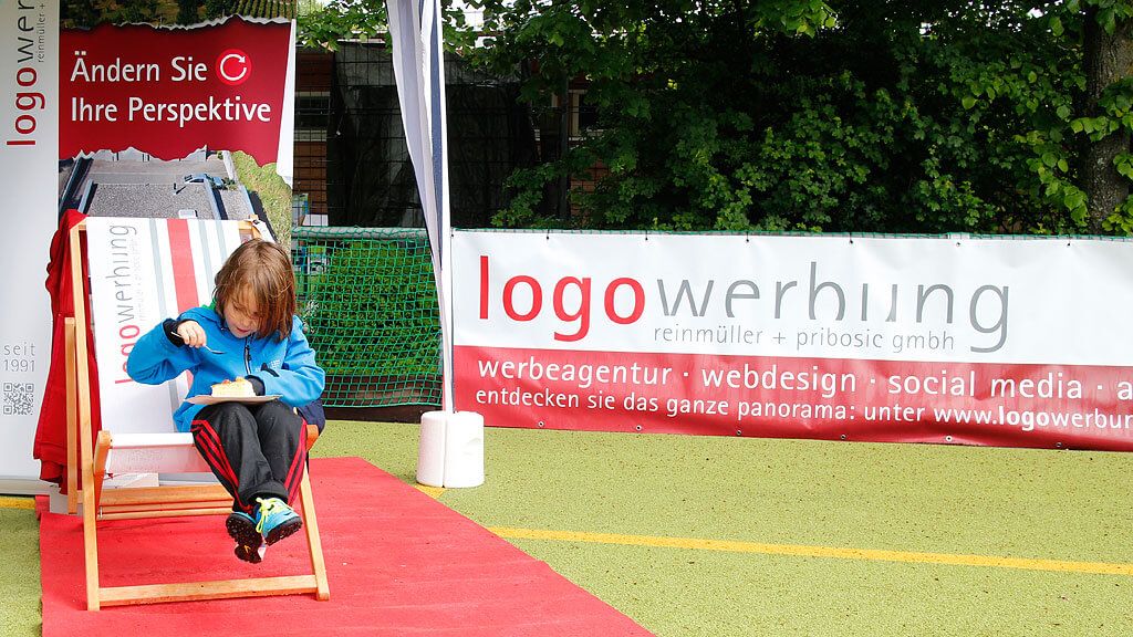Somit nutzten wir die Gelegenheit und präsentierten uns mit dem schon traditionellen roten Teppich, dem Liegestuhl und unserem Rollup vor der neu produzierten Bandenwerbung aus LKW-Plane. Leider hielt sich der Wettergott nicht an die Traditionen - es schüttete aus Kübeln. Daher schlüpften wir gerne unter eines der bereitgestellten Zelte. Nichts desto trotz blieb genügend Zeit und Raum für interessante Gespräche und ein Päuschen zwischendurch auf dem logowerbung-Liegestuhl.